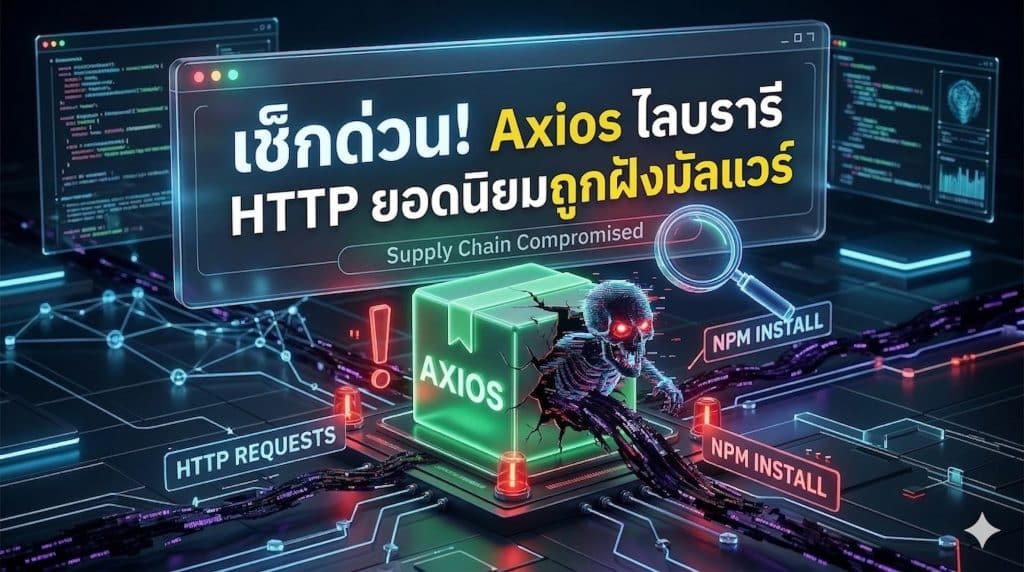 สวัสดีครับเพื่อนๆ และพี่น้องในวงการ IT ทุกคน วันนี้มีเรื่องด่วนที่ต้องรีบมาเตือนภัยกันครับ สำหรับใครที่พัฒนาซอฟต์แวร์ด้วย Node.js หรือใช้ JavaScript Library ยอดฮิตอย่าง Axios ต้องหยุดอ่านตรงนี้ก่อน เพราะเมื่อวันที่ 30-31 มีนาคม 2569 ที่ผ่านมา เกิดเหตุการณ์ Supply Chain Compromise ครั้งใหญ่ที่สะเทือนวงการสุดๆ ครับ